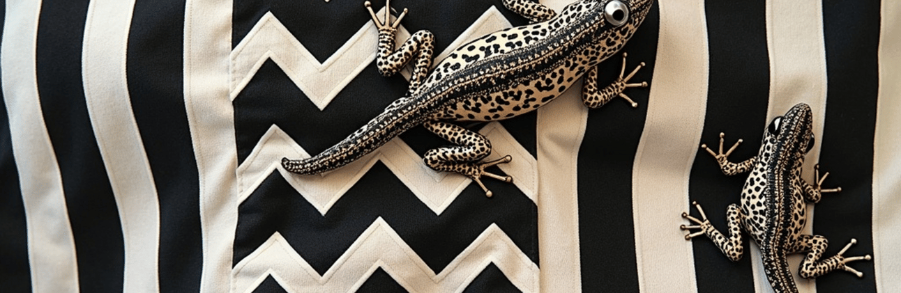 Diving into historic fashion designs, I've embraced the boldness of black and white stripes reminiscent of car signs, infused with chevron shapes. These timeless motifs bring a unique flair to my clothing line, complemented by whimsical frog and lizard patterns. Look forward to seeing these imaginative creations soon!
